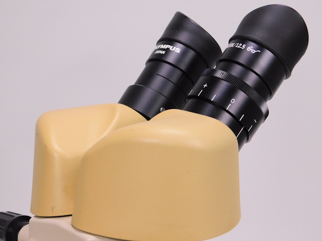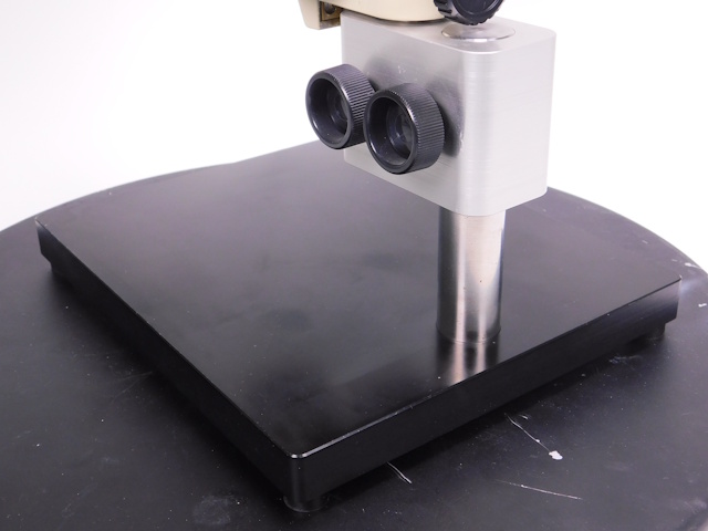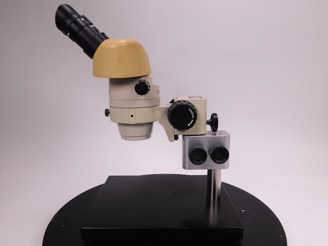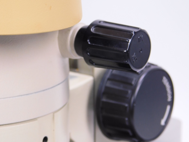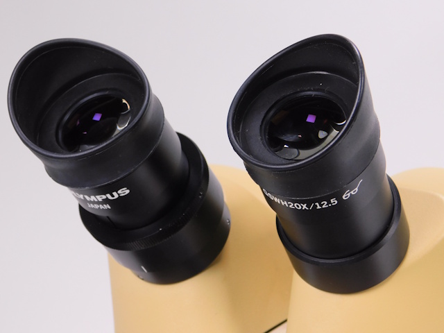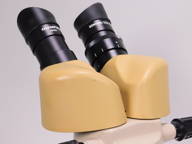 オリンパスの実体顕微鏡です。変倍方式で1倍と3倍に変倍できます。接眼レンズは20倍のレンズになるので、総合倍率は20倍と60倍になります。リングファイバーと光源装置がセットになります。外観は傷、塗装剥がれ等ありますが光学的、メカ的に問題ありません。 |
