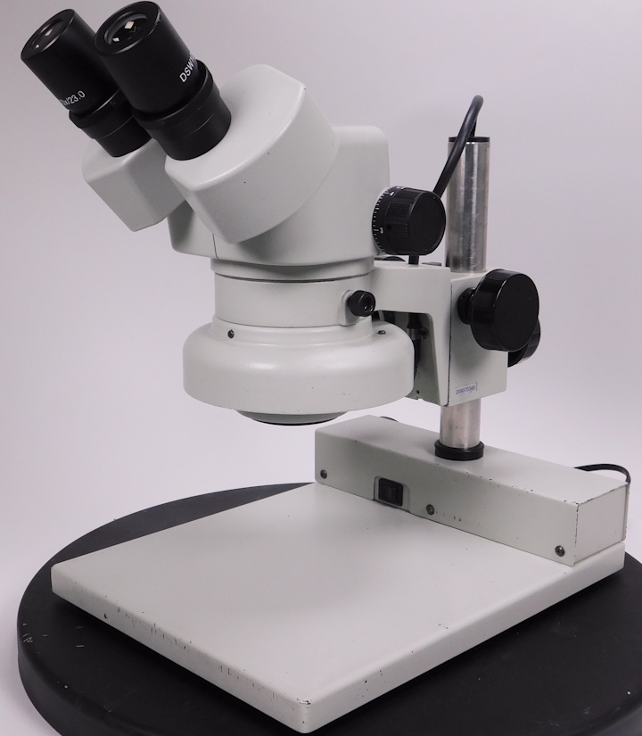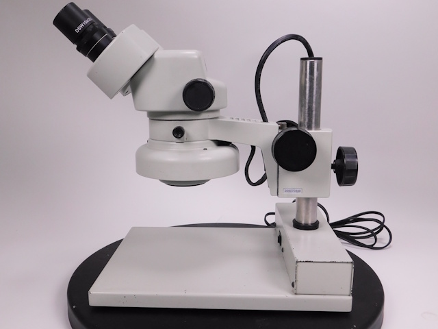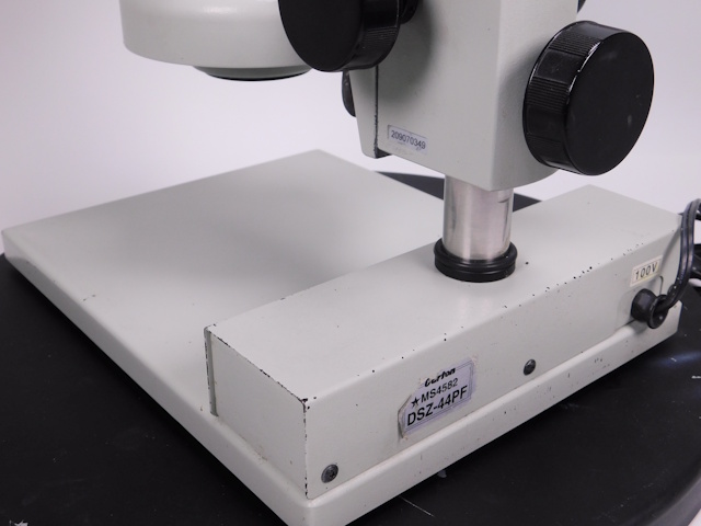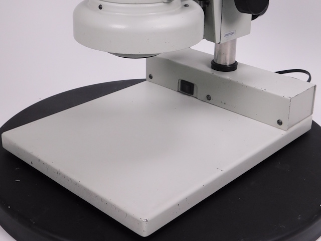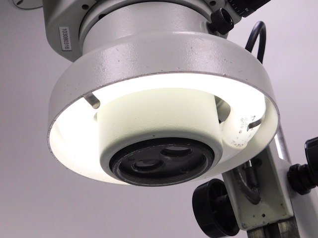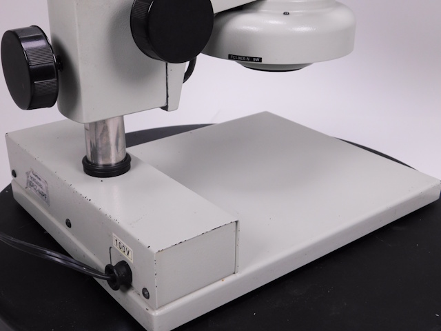 カートンのズーム式実体顕微鏡です。総合倍率は10倍から44倍までカバーします。照明は蛍光灯リング照明(9W)となります。外観はキズ、塗装剥げがありますが光学系、メカ系、照明系に問題ありません。 |