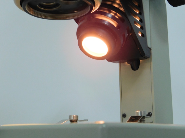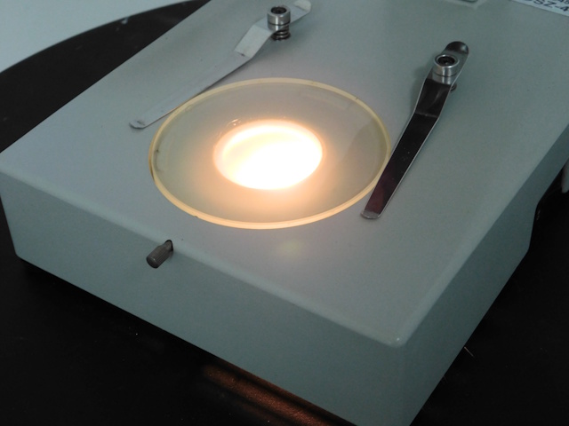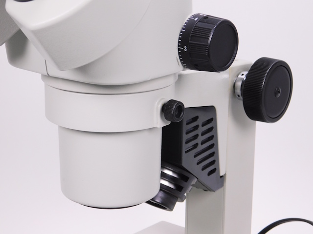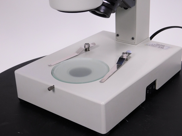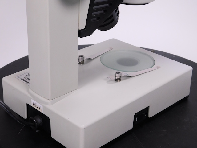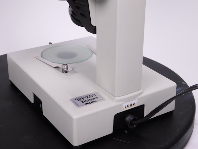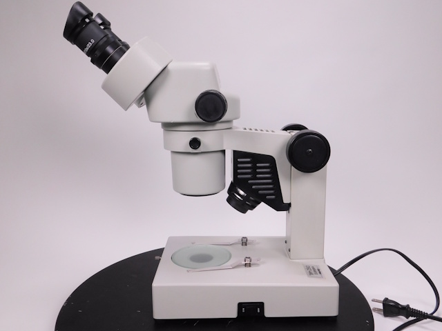 カートンのズーム式実体顕微鏡です。総合倍率は10倍から44倍までカバーします。架台に落射照明と透過照明がついております。。外観はキズ、塗装剥げがありますが光学系、メカ系、照明系に問題ありません。 |
