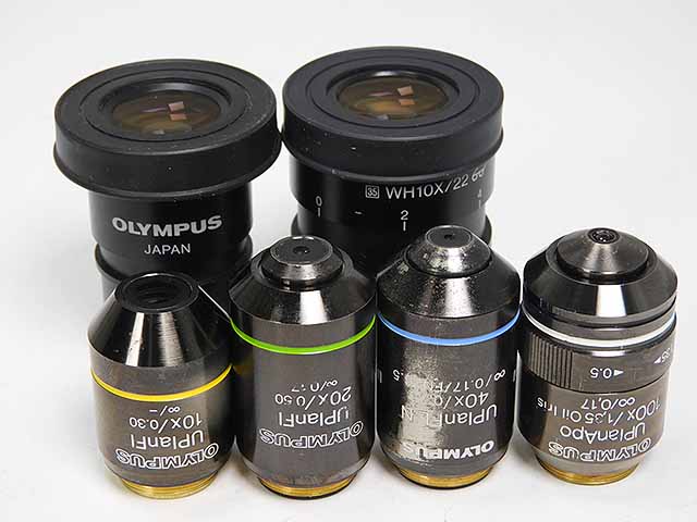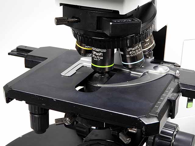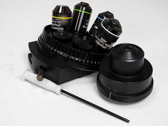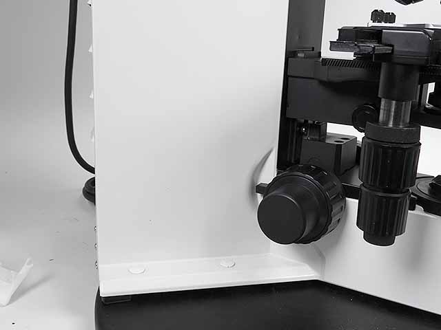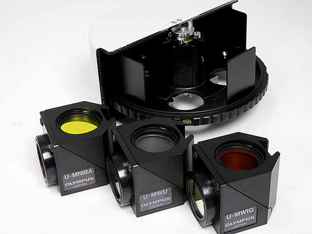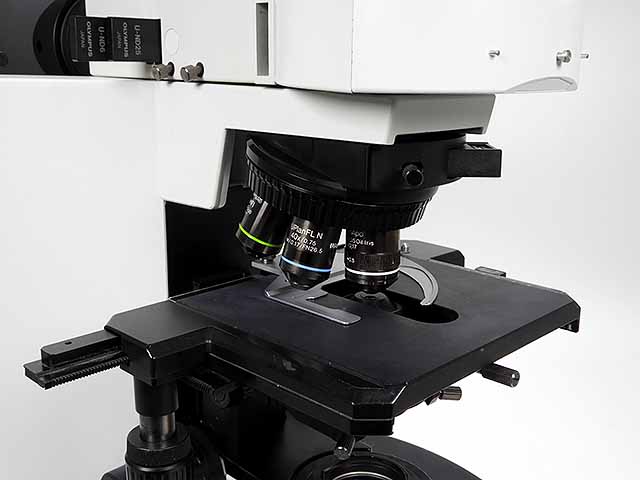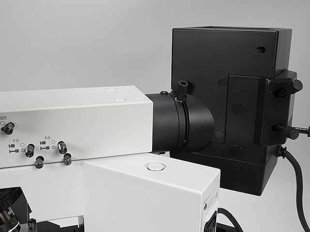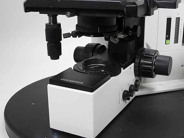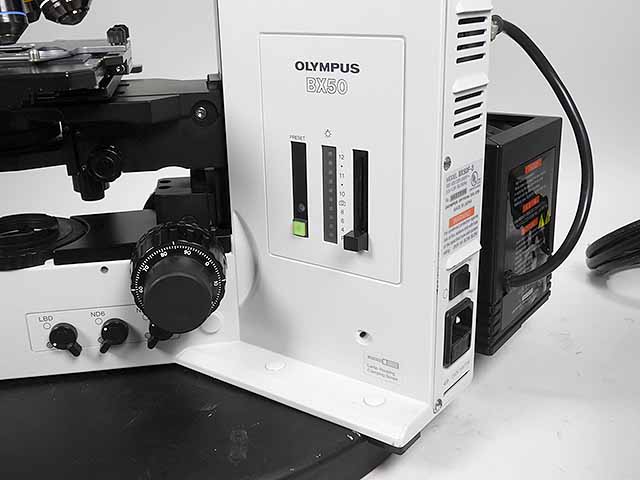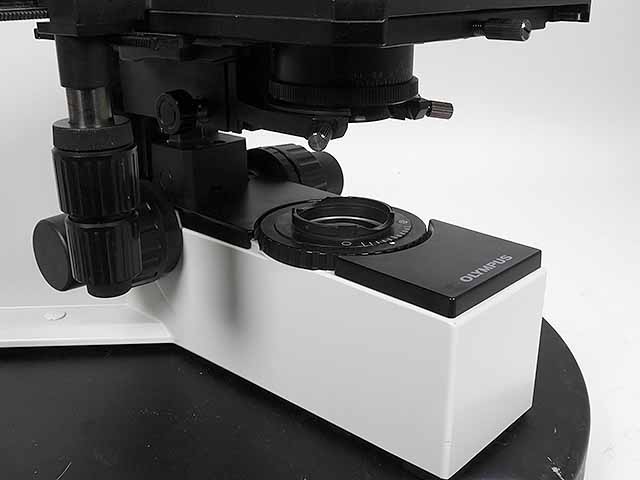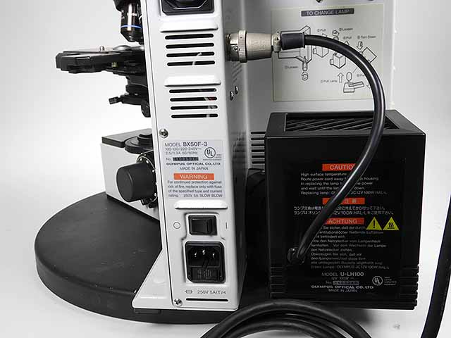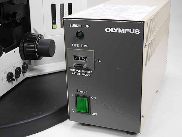 オリンパスの生物蛍光顕微鏡BX50-FLです。 対物レンズは高解像レンズ10x,20x,40x,100xとなります。蛍光観察はU励起、IB励起、G励起の3種類です。鏡筒はCマウント付き3眼鏡筒となります。程度は多少傷がありますが光学的、メカ的、電気的な問題はありません。(影響ないホコリ、キズ除く) |