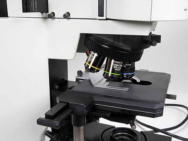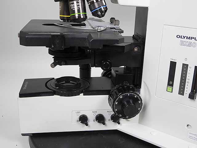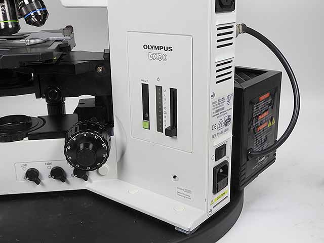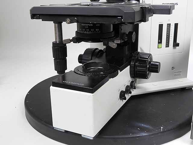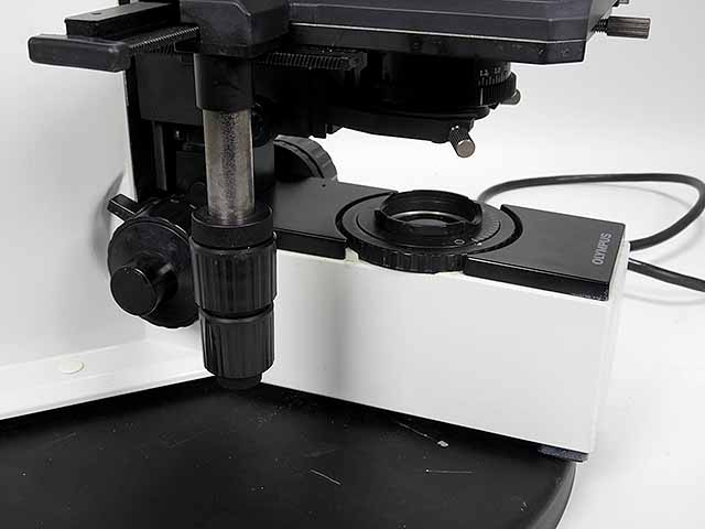 オリンパスの生物蛍光顕微鏡BX50-FLです。 対物レンズは高解像レンズ4x,,10x,20x,40xとなります。蛍光観察はU励起、V励起、B励起、G励起の4種類です。鏡筒はCマウント付き3眼鏡筒となります。程度は多少傷がありますが光学的、メカ的、電気的な問題はありません。(影響ないホコリ、キズ除く) |