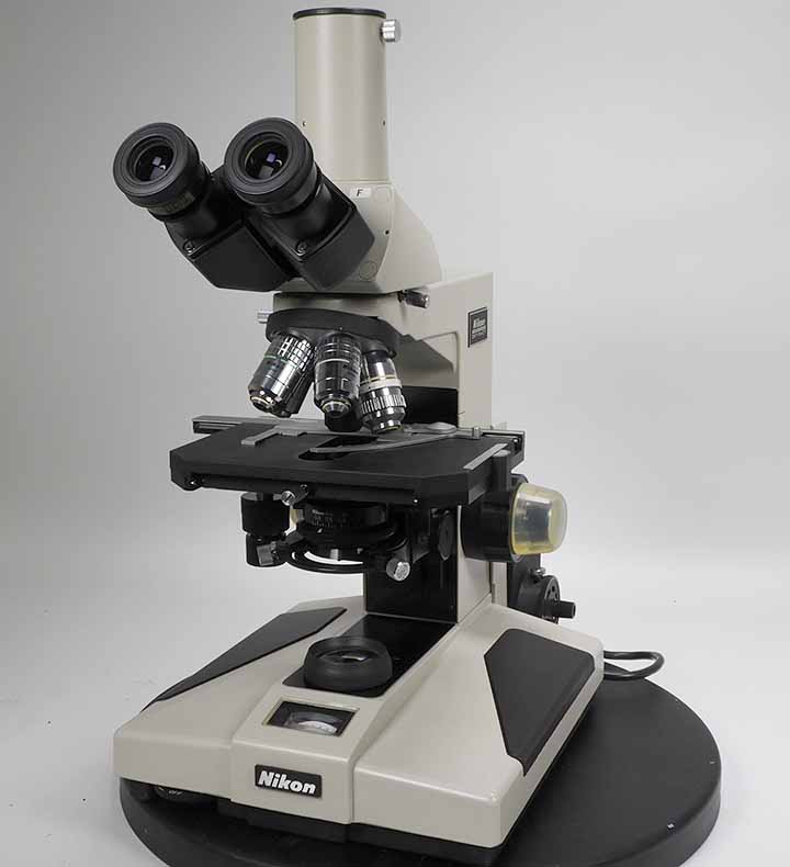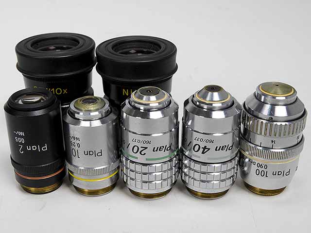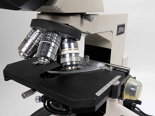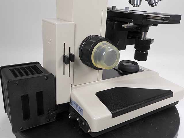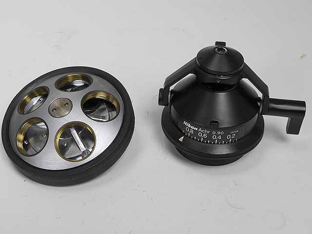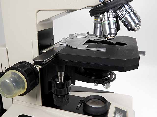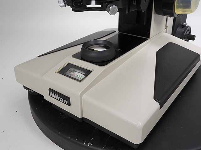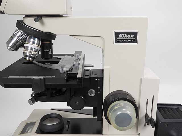 ニコン生物顕微鏡オプチフォトです。対物レンズは2x、10x、20x、40x、100xとなります。鏡筒は写真ポート付3眼鏡筒となります。外観はキズ、塗装剥げが多少ありますが光学系、電装系、メカ系問題ありません。 |