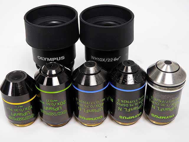 オリンパスの生物顕微鏡BX51です。 対物レンズはセミアポクロマート系10x/20x/40x/40x/100xとなります。透過明視野、暗視野、位相差観察が可能です。40xではネガティブ位相差観察ができます。鏡筒は3眼鏡筒にCマウントアダプタを組み合わせてますのでCマウントタイプデジカメが直接接続可能です。外観はキズ、塗装剥がれが少なく程度良好です。光学的、メカ的、電気的な問題はありません。(影響ないホコリ、キズ除く) |