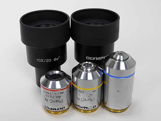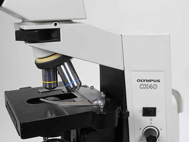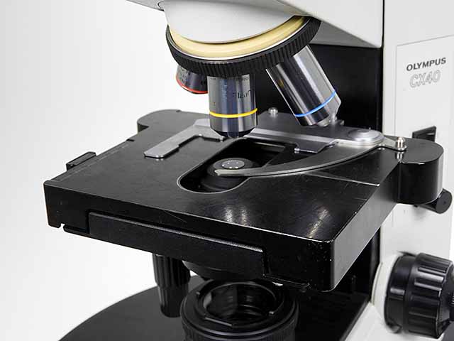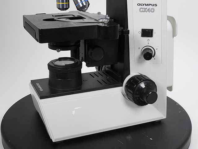 オリンパスの無限補正光学系の生物顕微鏡CX40です。UIS対物レンズ4x,10x,40xの3本が付きます。刻印が剥がれていますが見えに影響はありません。接眼レンズは10xとなります。鏡筒は双眼鏡筒です。コンディションは多少傷、塗装はがれありますが光学系、電装系、メカ径に問題はありません。 |