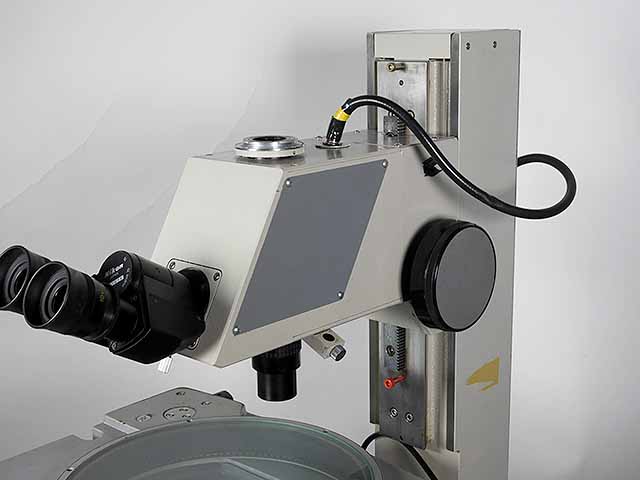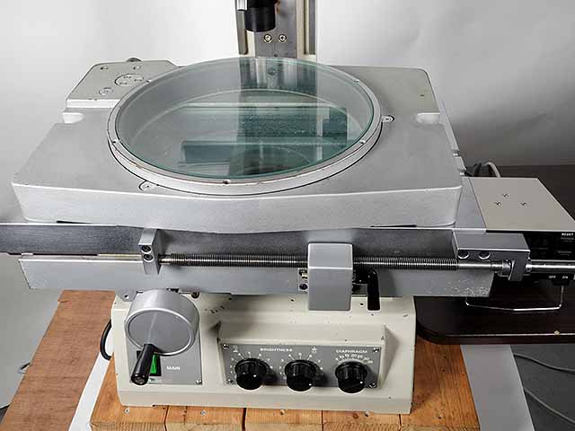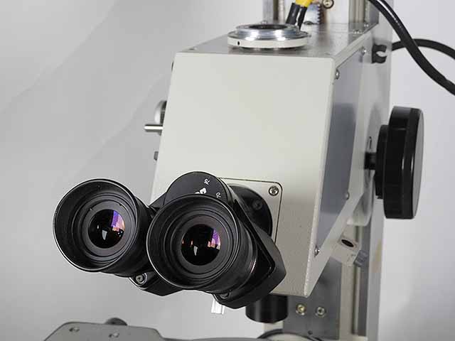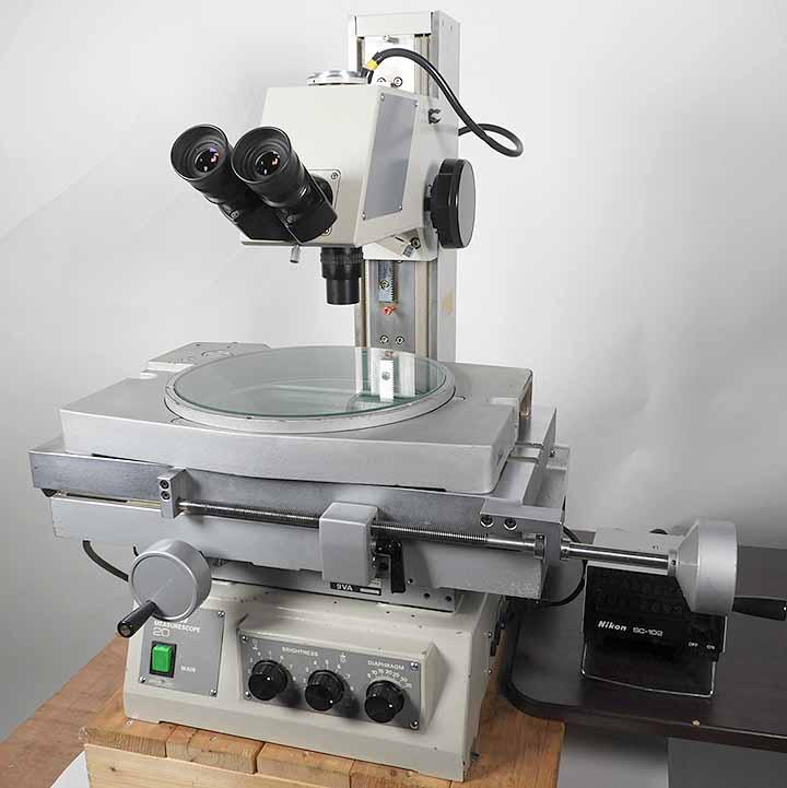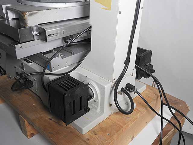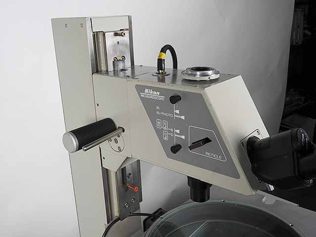 ニコンの寸法測定顕微鏡メジャースコープ20です。対物レンズは測定専用3倍レンズです。ステージは高精度、剛性のV&Flat方式でストロークはX200mm、Y75mmです。照明は透過光及び同軸落射照明、LEDリング照明の3種類となります。レチクルが鏡筒内蔵ですので左右の視差が発生しません。測定精度は実測値でX,Y,Zとも3μ以下ですので実用上問題ないと思います。