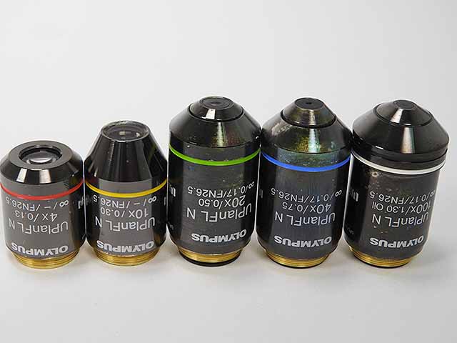 オリンパスの生物顕微鏡BX43です。 対物レンズは高解像レンズ4x,10x,40x,40x,100xとなります。本体は白色LEDです。鏡筒は3眼鏡筒となります。Cマウント付きです。光学的、メカ的、電気的な問題はありません。(影響ないホコリ、キズ除く) |