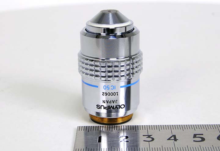 オリンパスのMSPlanApo50xです。先端カバーにキズがありますが光学系には問題ありません。ネジ取付径はΦ20mmです。 |