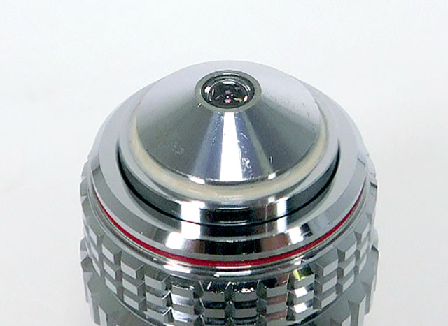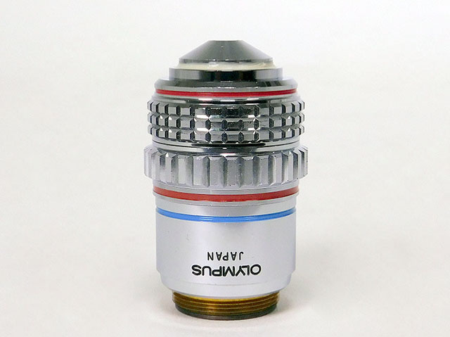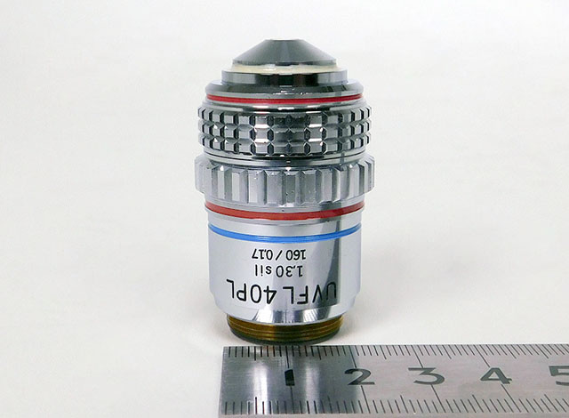 オリンパスの高解像対物レンズUVFL40xです。低自家蛍光光学系で蛍光観察に適します。液浸でシリコンオイルが必要となります。光学系に問題ありません。ネジ取付径はΦ20mmです。 |